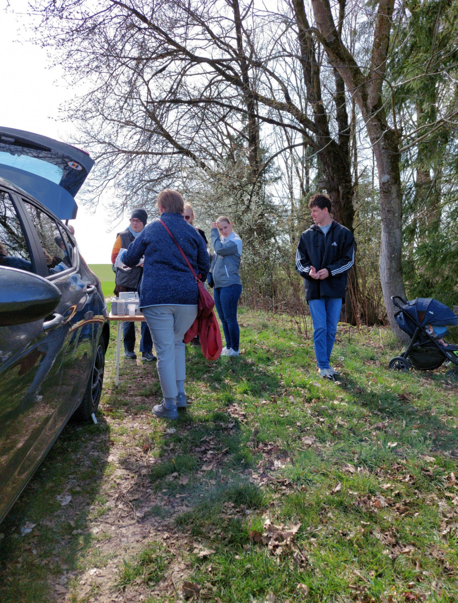 Wir trafen uns an der Kirche in Sünzhausen. Nach einer kurzen Andacht mit unserem Diakon Walter Schwind ging es zum Ostereiersuchen an einem schönen Platz in der Nähe.